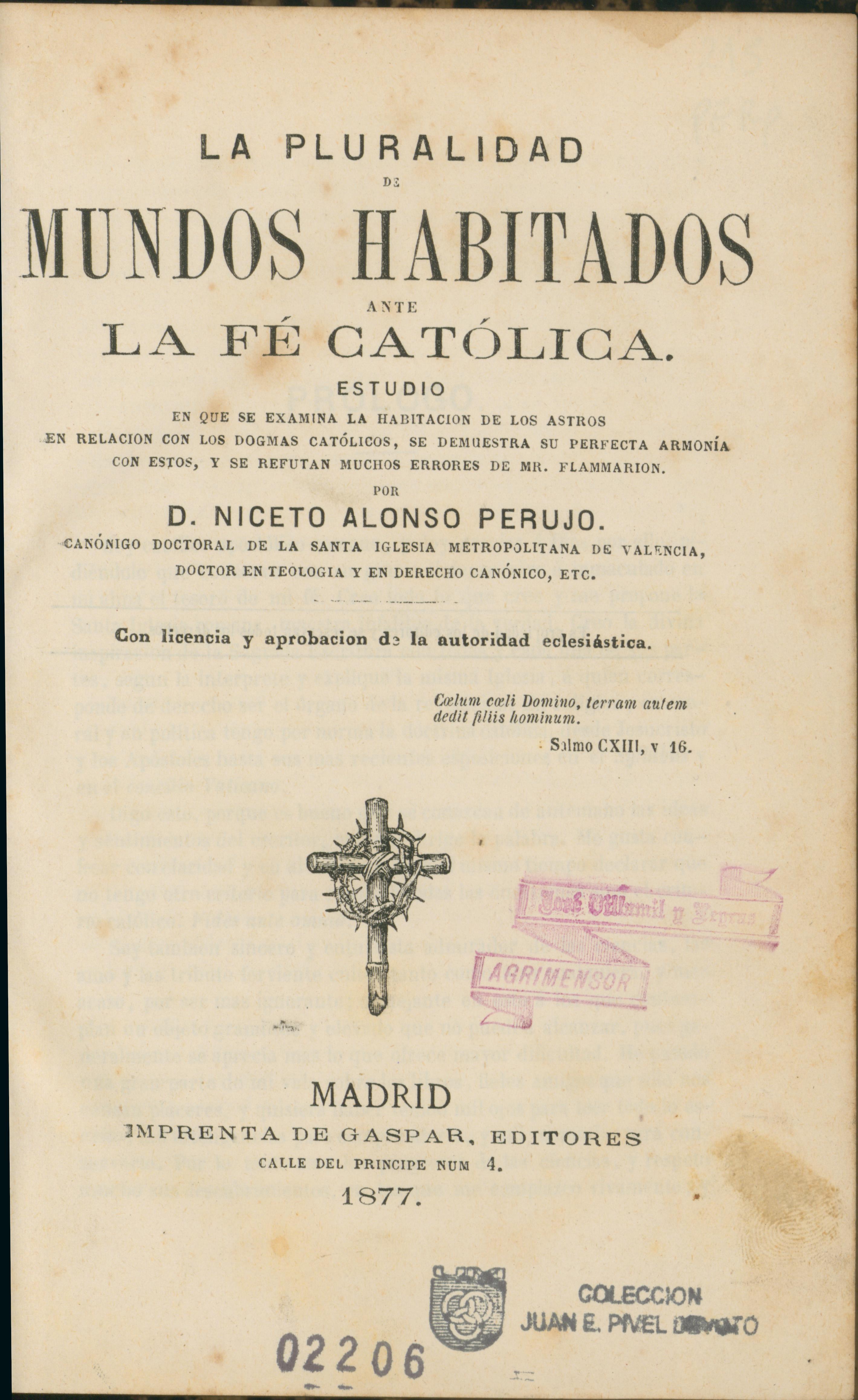 La pluralidad de mundos habitados ante la fe católica [texto impreso] / Niceto Alonso Perujo (1841-1890) . - Madrid : Imprenta de Gaspar, Editores, 1877 . - viii, 456 p. Estudio en que se examina la habitación de los astros en relación con los dogmas católicos, se demuestra su perfecta armonía con estos, y se refutan muchos errores de Mr. Flammarion. Documento digitalizado por la Biblioteca Digital Hispánica Idioma : Español (spa)