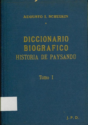 Historia de Paysandú : diccionario biográfico [texto impreso] / Augusto Isidoro Schulkin (1918-1998) . - Buenos Aires : Von Roosen, 1958 . - v.1, 504 p. Dedicado por Augusto I. Schulkin a Juan E. Pivel Devoto, en hoja anterior a la portada, Buenos Aires, 16/03/1958 Idioma : Español (spa)