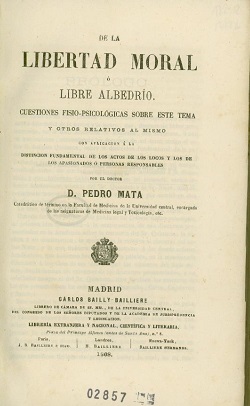 De la libertad moral ó libre albedrío. Cuestiones fisio-psicológicas sobre este tema y otros relativos al mismo con aplicacion á la distincion fundamental de los actos de los locos y los de los apasionados ó personas responsables [texto impreso] / Pedro D. Mata . - Madrid : Cárlos Bailly-Bailliere, 1868 . - 457 p. Idioma : Español (spa)