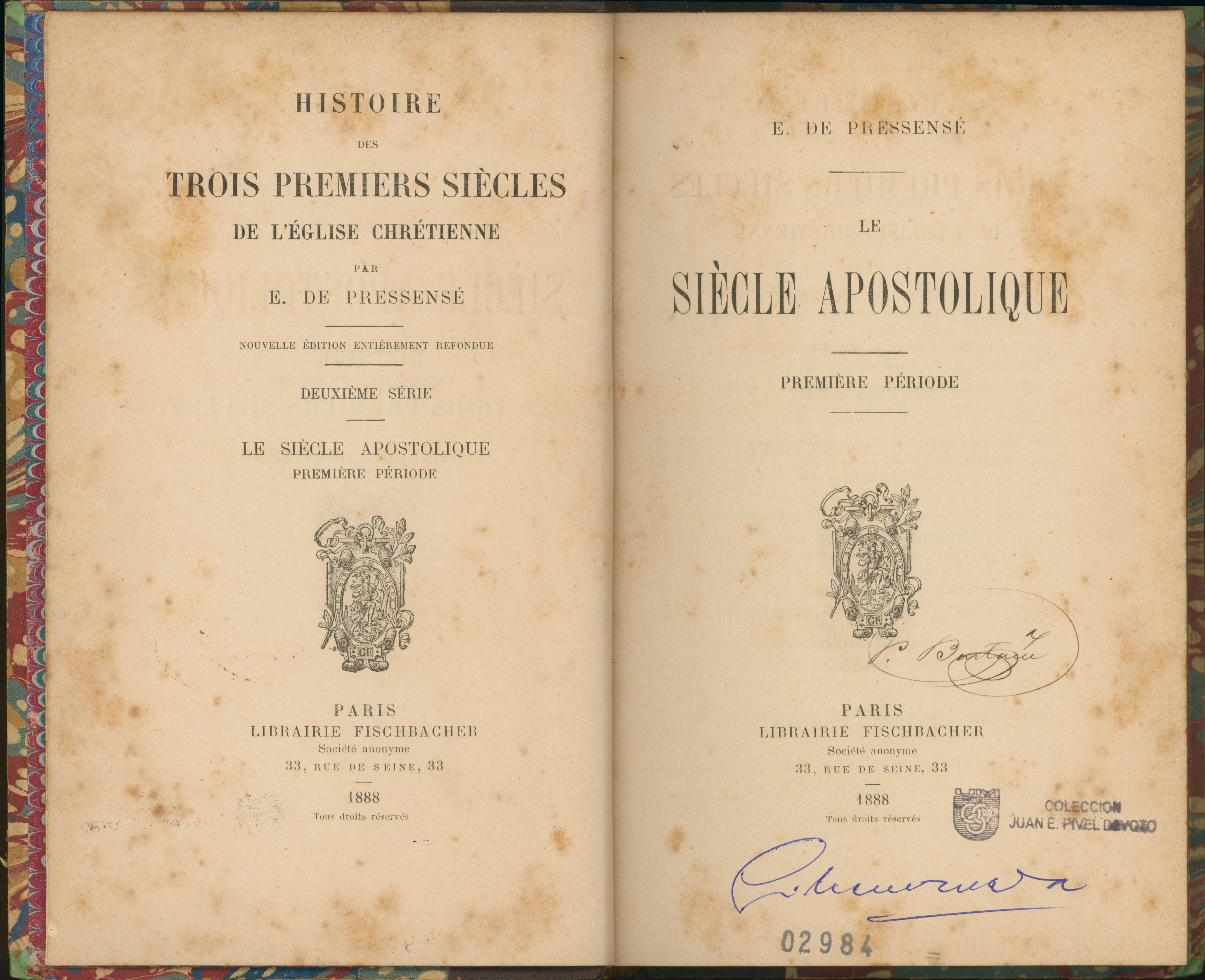 Histoire des trois premiers siècles de l´église chrétienne. Le siècle apostolique : première pèriode : le siècle apostolique [texto impreso] / Edmond Dehault de Pressensé . - Paris : Librairie Fischbacher, 1889 . - v.1, lv, 413 p. Idioma : Francés (fre)
