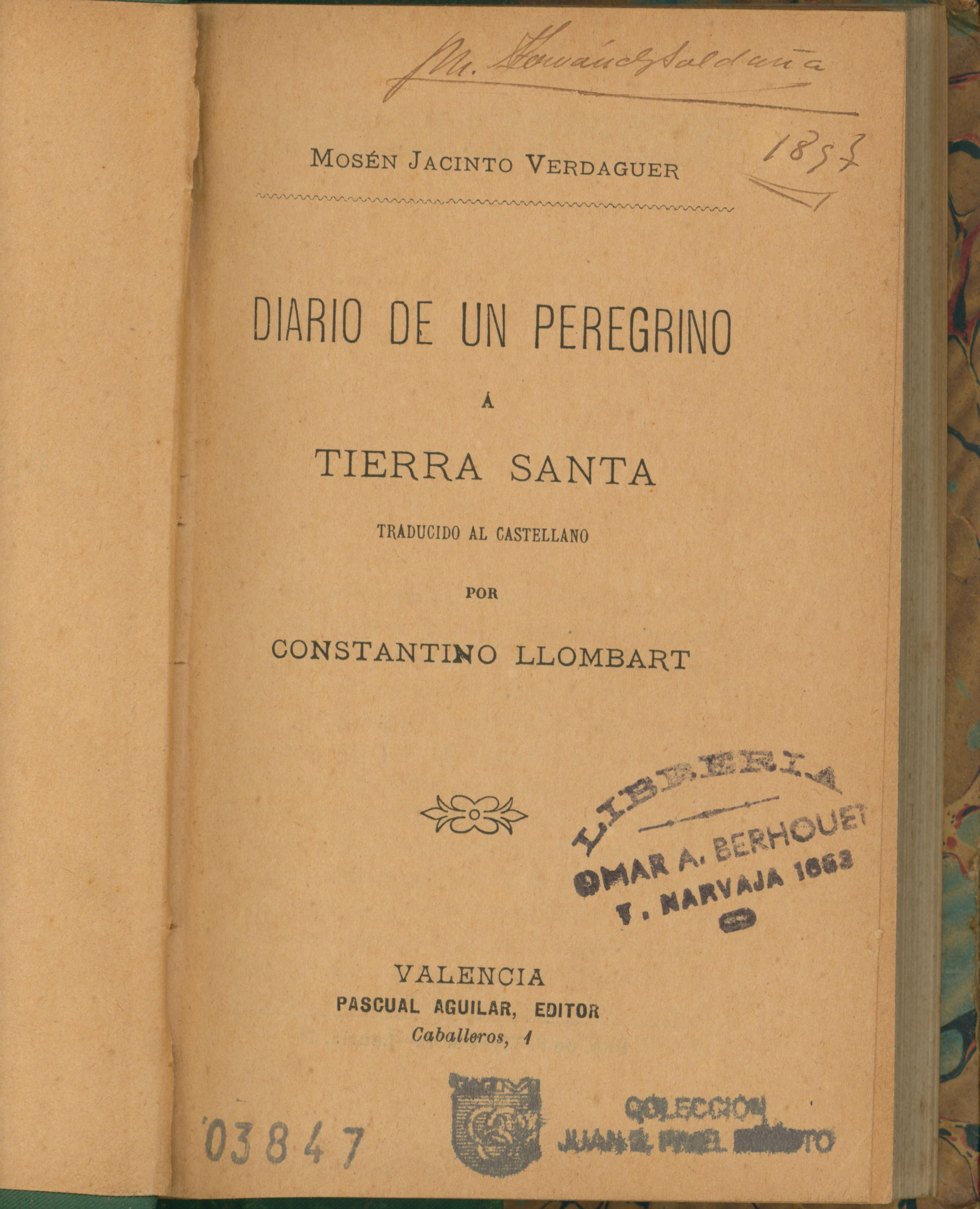 Diario de un peregrino a Tierra Santa [texto impreso] / Jacinto Verdaguer (1845-1902) ; Constantino Llombart, Traductor . - Valencia : Pascual Aguilar, Editor, 1887? . - 161 p.. - (Biblioteca Selecta; 57) . Encuadernado con: Poesie illustrate / Arnaldo Fusinato. Autografiado en la portada, 1897. Idioma : Español (spa)