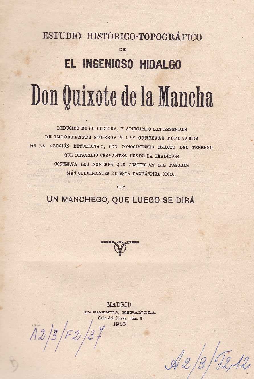 Estudio histórico-topográfico de el ingenioso hidalgo Don Quixote de la Mancha : deducido de su lectura, y aplicando las leyendas de importantes sucesos y las consejas populares de la "Región Beturiana" con conocimiento exacto del terreno que describió Cervantes, donde la tradición conserva los nombres que justifican los pasajes más culminantes de esta fantástica obra [texto impreso] / Miguel de Cervantes Saavedra (1547-1616) ; Juan Francisco de la Jara y Sánchez de Molina . - Madrid : Imprenta Española, 1916 . - 2 v. ; 23 x 16 cm. Oeuvre : [Don Quijote de la Mancha] Al principio del vol. 2 se incluye El Buscapié de Adolfo de Castro. Documento digitalizado por la Biblioteca Digital Hispánica Idioma : Español (spa) Idioma original : Español (spa)