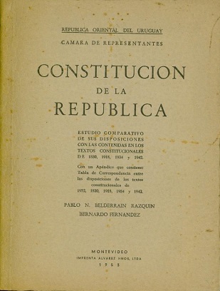 Constitución de la República : estudio comparativo de sus disposiciones con las contenidas en los textos constitucionales de 1830, 1918, 1934 y 1942 [texto impreso] / Pablo N. Belderrain Razquin ; Bernardo Fernández . - Montevideo : Cámara de Representantes, 1953 . - 150 p. ; 22 x 17 cm. Obra publicada por resolución de la Cámara de Representantes, de fecha 3 de Noviembre de 1952 Idioma : Español (spa)