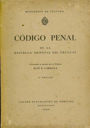 Código penal : de la República Oriental del Uruguay [texto impreso] / Uruguay. Ministerio de Cultura ; Juan B. Carballa, Prologuista . - 2a.ed. . - Montevideo : Centro Estudiantes de Derecho, 1968 . - 854 p. ; 25 x 17 cm. Concordado y anotado por el Profesor Juan B. Carballa. Contiene un documento con el Anexo del Código Penal: Ley 9.155. Sustitución de disposiciones, Ley de 18 de octubre de 1934. Idioma : Español (spa)
