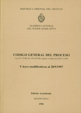 Código general del proceso : Ley N° 15.982 al 18/10/1988 vigente a partir del 20/11/1989 : y leyes modificadas al 28/09/19997 [texto impreso] / Uruguay. Asamblea General del Poder Legislativo . - Montevideo : [s.n.], 1998 . - 192 p. ; 24 x 17 cm. Idioma : Español (spa)