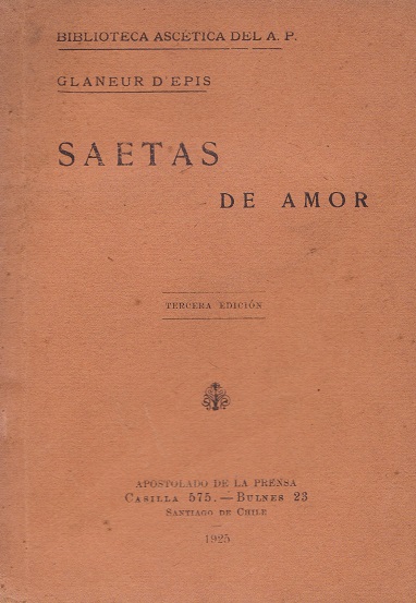 Saetas de amor [texto impreso] / Glaneur D'Epis . - 3a.ed. . - Santiago de Chile : Apostolado de la Prensa, 1925 . - 79 p. ; 19 x 13 cm. - (Biblioteca de Ascética) . Idioma : Español (spa)