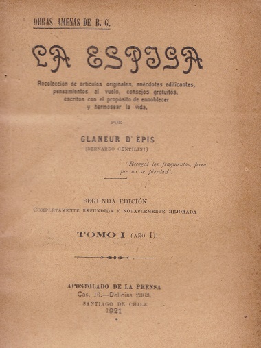 Obras amenas. La espiga [texto impreso] / Glaneur D'Epis . - 2a.ed. . - Santiago de Chile : Apostolado de la Prensa, 1921-1925, 1929-1930 . - 9 v. ; 19 x 13 cm. Recolección de artículos originales, anécdotas edificantes, pensamientos al vuelo, consejos gratuitos, escritos con el propósito de ennoblecer y hermosear la vida Idioma : Español (spa)