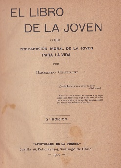 El libro de la joven o sea preparación moral de la joven para la vida [texto impreso] / Bernardo Gentilini (1875-1936) . - 2a.ed. . - Santiago de Chile : Apostolado de la Prensa, 1920 . - 267 p. ; 19 x 14 cm. Encuadernado en tela Idioma : Español (spa)