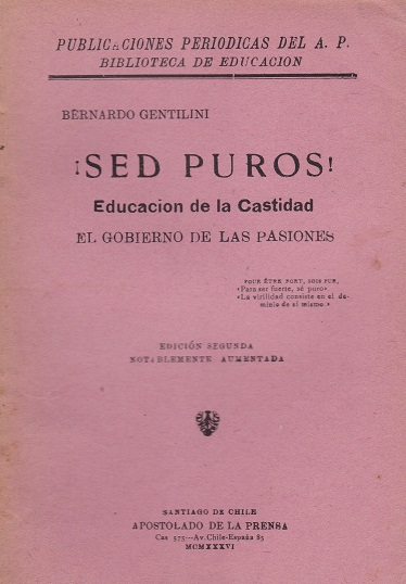 ¡Sed puros! : educación de la castidad. El gobierno de las pasiones [texto impreso] / Bernardo Gentilini (1875-1936) . - 2a.ed. . - Santiago de Chile : Apostolado de la Prensa, 1936 . - 114 p. ; 18 x 13 cm. Precede al título: Publicaciones Periódicas del A.P. Biblioteca de Educación Idioma : Español (spa)