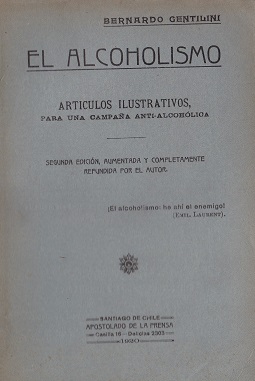 El alcoholismo : artículos ilustrativos, para una campaña anti-alcohólica [texto impreso] / Bernardo Gentilini (1875-1936) . - 2a.ed. corr. y aum. . - Santiago de Chile : Apostolado de la Prensa, 1920 . - 136 p. ; 19 x 13 cm. Idioma : Español (spa)
