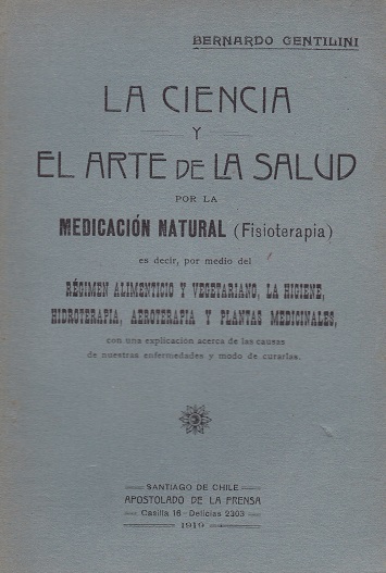 La ciencia y el arte de la salud : por la medicación natural (fisioterapia) [texto impreso] / Bernardo Gentilini (1875-1936) . - Santiago de Chile : Apostolado de la Prensa, 1919 . - 270 p. ; 19 x 13 cm. Régimen alimenticio y vegetariano, la higiene, hidroterapia, aeroterapia y plantas medicinales, con una explicación acerca de la causa de nuestras enfermedades y modo de curarlas Idioma : Español (spa)