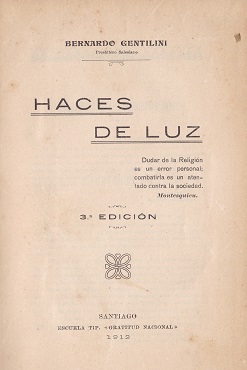 Haces de luz [texto impreso] / Bernardo Gentilini (1875-1936) . - 6a.ed. corr. y aum. . - Santiago de Chile : Apostolado de la Prensa, 1923 . - 1 v. (p. varía) ; 19 x 14 cm. - (Biblioteca Apologética) . Serie II. Varias separatas encuadernadas juntas Idioma : Español (spa)