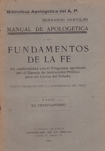 Manual de apologética o sea fundamentos de la fe [texto impreso] / Bernardo Gentilini (1875-1936) . - Santiago de Chile : Apostolado de la Prensa, 1924 . - 3 v. ; 19 x 14 cm. - (Biblioteca Apologética) . En conformidad con el Programa aprobado por el Consejo de Instrucción Pública para los Liceos del Estado. Idioma : Español (spa)