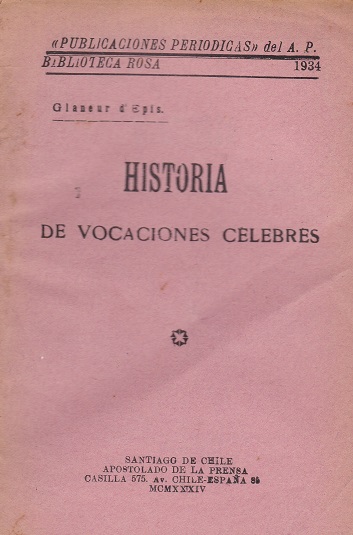 Historia de vocaciones célebres [texto impreso] / Glaneur D'Epis . - Santiago de Chile : Apostolado de la Prensa, 1934 . - 109 p. ; 19 x 13 cm. Precede al título: Publicaciones Periódicas del A.P. Biblioteca Rosa Idioma : Español (spa)