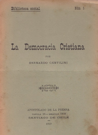 La democracia cristiana [texto impreso] / Bernardo Gentilini (1875-1936) . - Santiago de Chile : Apostolado de la Prensa, 1919 . - 110 p. ; 19 x 13 cm. - (Biblioteca Social; 5) . Idioma : Español (spa)