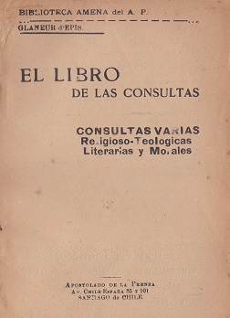 El libro de las consultas : consultas varias. Religioso-teológicas literarias y morales [texto impreso] / Glaneur D'Epis . - Santiago de Chile : Apostolado de la Prensa, [19-?] . - 1 v. (p. varía) ; 18 x 13 cm. - (Biblioteca Amena) . Idioma : Español (spa)