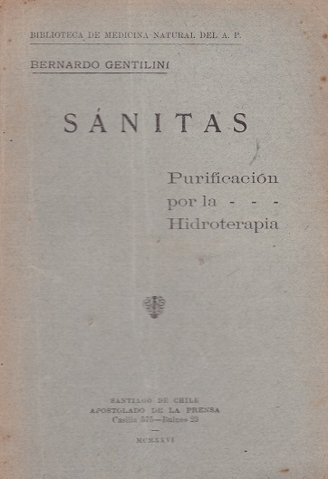 Sánitas : purificación por la hidroterapia [texto impreso] / Bernardo Gentilini (1875-1936) . - Santiago de Chile : Apostolado de la Prensa, 1926 . - 78 p. ; 18 x 13 cm. Precede al título: Biblioteca de Medicina Natural del A.P. Idioma : Español (spa)