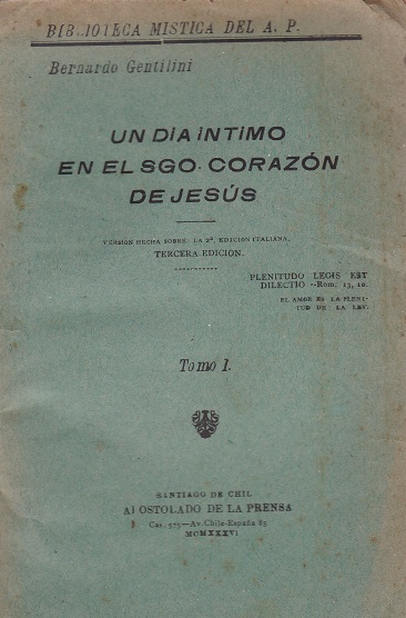Un día íntimo en el sgo. corazón de Jesús [texto impreso] / Bernardo Gentilini (1875-1936) . - 3a.ed. . - Santiago de Chile : Apostolado de la Prensa, 1936 . - 2 v. ; 18 x 13 cm. Precede al título. Biblioteca Mística del A.P. Idioma : Español (spa)