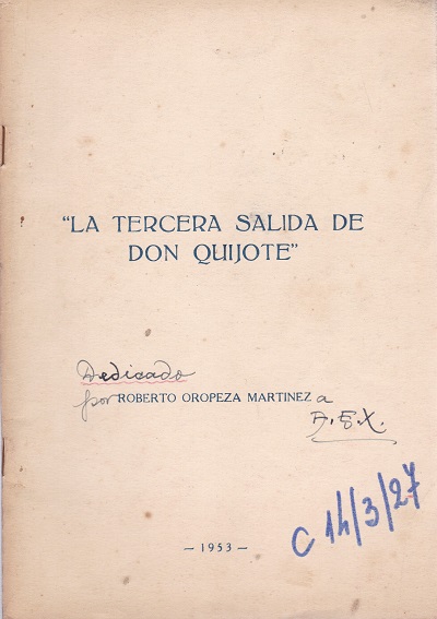 La tercera salida de Don Quijote : tesis [texto impreso] / Roberto Oropeza Martínez . - [S.l.] : [s.n.], 1953 . - 48 p. ; 23 x 16 cm. Dedicado y autografiado por Roberto Oropeza Martínez a Arturo E. Xalambrí, en la guarda, México D.F, noviembre 1956. EPHEMERA: carta manuscrita escrita por Roberto Oropeza Martínez a Arturo E. Xalambrí, en la portada. 4 hojas mecanografiadas con poemas de Erasmo Castellanos Quinto, en la portada. Idioma : Español (spa)