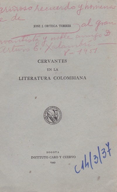 Cervantes en la literatura colombiana [texto impreso] / José J. Ortega Torres . - Bogotá : Instituto Caro y Cuervo, 1949 . - 31 p. ; 24 x 16 cm. Dedicado por José J. Ortega Torres a Arturo E. Xalambrí, Mayo, 1951. Idioma : Español (spa)