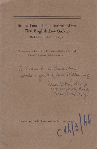 Some textual peculiarities of the firsth english Don Quixote [texto impreso] / Edwin B. Knowles . - [S.l.] : The Bibliographical Society of America, 1943 . - 12 p. ; 24 x 16 cm. Separate from the Papers of the Bibliographical Society of America, Volume Thirty-seven, Third Quarter, 1943. Dedicado y autografiado por Carl T. Keller a Arturo E. Xalambrí, en la cubierta, Scarsdale, N.Y. Idioma : Inglés (eng)