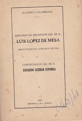 Discursos de recepción del Sr. Do. Luis Lopez de Mesa pronunciado el 11 de mayo de 1935 : contestación del Sr. D. Eduardo Guzman Esponda [texto impreso] . - Bogotá : A. B. C., 1935 . - 72 p. ; 24 x 18 cm. Precede al título: Academia Colombiana. Encuadernación media holandesa, con nervios dorados en el lomo. Idioma : Español (spa)