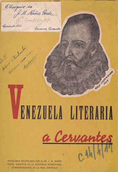 Venezuela literaria a Cervantes [texto impreso] / José Manuel Nuñez Ponte, Compilador . - Caracas : Tipografía La Nación, 1948 . - 208 p. : il. lám., (fotografía) ; 23 x 16 cm. EPHEMERA: Tarjeta que menciona que el ejemplar es obsequio de José Manuel Núñez Ponte a Artuto E. Xalambrí, en la cubierta. Copia de dos cartas que envió Arturo E. Xalambrí a José Manuel Núñez Ponte, fechadas 06/01/1951 y 5/06/1955 Idioma : Español (spa)
