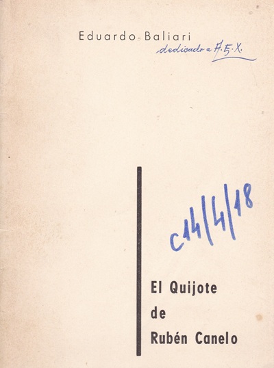 El Quijote de Rubén Canelo [texto impreso] / Eduardo Baliari ; Rubén Canelo (1929-2010) . - Buenos Aires : [s.n.], 1963 . - 16 p. : il. lám., (dibujo) ; 18 x 13 cm. - (Cuaderno de Caballete; 3) . Dedicado y autografiado por Eduardo Baliari a Arturo E. Xalambrí, en la portada, Buenos Aires, 23/04/1964 Idioma : Español (spa)