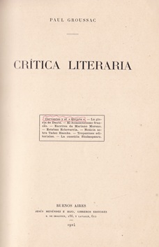 Critica literaria [texto impreso] / Paul Groussac (1848-1929) . - Buenos Aires : Jesús Menéndez e Hijo, Libreros Editores, 1924 . - 415 p. ; 23 x 14 cm. Encuadernación media holandesa, con nervios dorados en el lomo. Idioma : Español (spa)