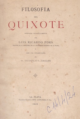 Filosofía del Quixote [texto impreso] / Luis Ricardo Fors (1843-1916) ; Estanislao S. Zeballos . - La Plata (Argentina) : Talleres Gráficos de Sesé y Larrañaga, 1906 . - viii, 130 p. ; 23 x 16 cm. Introducción del Dr. Estanislao S. Zeballos. Encuadernación media holandesa. Idioma : Español (spa)