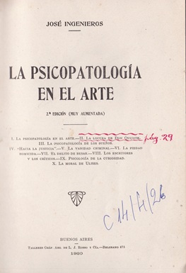La psicopatología en el Arte [texto impreso] / José Ingenieros (1877-1925) . - Buenos Aires : Talleres Gráficos Argentinos L. J. Rosso, 1920 . - 216 p. ; 23 x 15 cm. Encuadernación media holandesa, con nervios dorados en el lomo. Idioma : Español (spa)