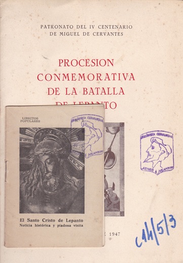 Procesión conmemorativa de la Batalla de Lepanto [texto impreso] / Patronato del IV Centenario de Miguel de Cervantes . - Madrid : Magisterio Español, 1947 . - 13 p. : il. lám., (fotografía) (sepia) ; 23 x 16 cm. 7 de octubre de 1947. EPHEMERA: Libritos Populares, El Santo Cristo de Lepanto. Noticia histórica y piadosa visita. Editorial Balmes, pegado a la cubierta de este ejemplar. Invitación a la procesión por parte de Los Ministros de Marina y Educación Nacional, pegado en la guarda. Idioma : Español (spa)