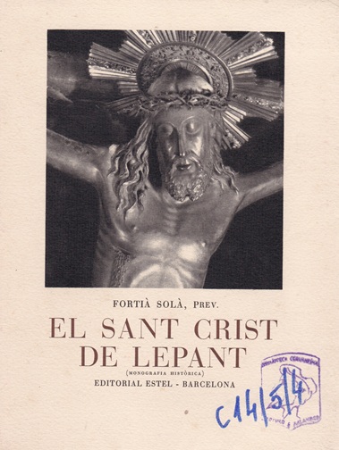 El Sant Crist de Lepant : prodigiosa imatge venerada a la Catedral de Barcelona : (monografía histórica) [texto impreso] / Fortià Solà (1876-1948) . - Barcelona : Ma: Montserrat Borrat, Editora, [1950] . - 116 p. : il. lám., (fotografía) ; 23 x 17 cm. Se han tirado 25 ejemplares en papel especial de la Casa Guarro, firmados por los canónigos de la Santa Catedral, por los herederos del autor y por la editora, numerados del 1 al 25. 375 ejemplares en papel "ingres" de la Casa Guarro, numerados del 26 al 375, 300 ejemplares en papel offset de los que consta esta edición. Idioma : Catalán (cat) | ![]() |
