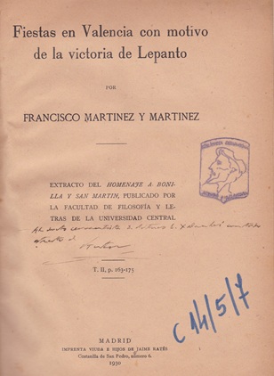 Fiestas en Valencia con motivo de la victoria de Lepanto [texto impreso] / Francisco Martínez y Martínez (1866-1946) . - Madrid : Imprenta Viuda e Hijos de Jaime Ratés, 1930 . - 13 p. ; 24 x 17 cm. Extracto del homenaje a Bonilla y San Martín, publicado por la Facultad de Filosofía y Letras de la Universidad Central, T. II, p. 163-175. Dedicado por Francisco Martínez y Martínez a Arturo E. Xalambrí, en la portada. Encuadernación media holandesa. Idioma : Español (spa) Catalán (cat)