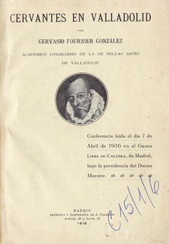 Cervantes en Valladolid : conferencia leída el día 7 de Abril de 1916 en el "Grupo Libre de Cultura", de Madrid [texto impreso] / Gervasio Fournier González (1842-1922) . - Madrid : Imprenta y Litografía de J. Palacios, 1916 . - 31 p. ; 21 x 15 cm. Encuadernación media holandesa. Documento digitalizado por la Biblioteca Digital Hispánica. Idioma : Español (spa)