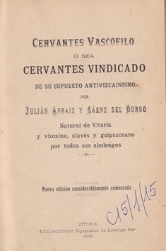 Cervantes vascófilo ó sea Cervantes vindicado de su supuesto antivizcainismo [texto impreso] / Julián Apraiz y Sáenz del Burgo (1848-1910) . - Vitoria : Establecimiento Tipográfico de Domingo Sar, 1895 . - 284 p. ; 21 x 14 cm. Encuadernación media holandesa, con nervios dorados en el lomo. Idioma : Español (spa)