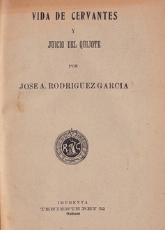 Vida de Cervantes y juicio del Quijote [texto impreso] / José Antonio Rodríguez García (1864-1934) . - Habana : Imprenta Teniente Rey, [1904?] . - 135 p. ; 21 x 15 cm. Encuadernación media holandesa. Documento digitalizado por la Biblioteca Digital Hispánica. Idioma : Español (spa)
