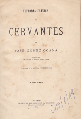 Historia clínica de Cervantes [texto impreso] / José Gómez Ocaño (1860-1919) . - Madrid : Imprenta de los Hijos de M.G. Hernández, 1899 . - 13 p. ; 25 x 16 cm. Encuadernación media holandesa. Documento digitalizado por la Biblioteca Digital Hispánica. Idioma : Español (spa)