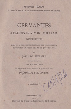 Cervantes : administrador militar. Conferencia dada en la sesión extraordinaria que celebró dicha institución la noche del 19 de junio de 1879 [texto impreso] / Jacinto Hermúa ; Ladislao del Corral, Prologuista . - Madrid : Imprenta del Cuerpo Administrativo del Ejército, 1879 . - xvi, 60 p. ; 22 x 15 cm. Precede al título: Reuniones Técnicas de Jefes y Oficiales de Administración Militar en Madrid. Encuadernación media holandesa. Documento digitalizado por la Biblioteca Digital Hispánica. Idioma : Español (spa)