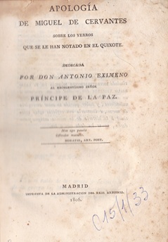 Apología de Miguel de cervantes sobre los yerros que se le han notado en el Quixote [texto impreso] / Antonio Eximeno (1729-1808) . - Madrid : Imprenta de la Administración del Real Arbitrio, 1806 . - 139 p. ; 20 x 14 cm. Encuadernación media holandesa. Documento digitalizado por la Biblioteca Digital Hispánica. Idioma : Español (spa)
