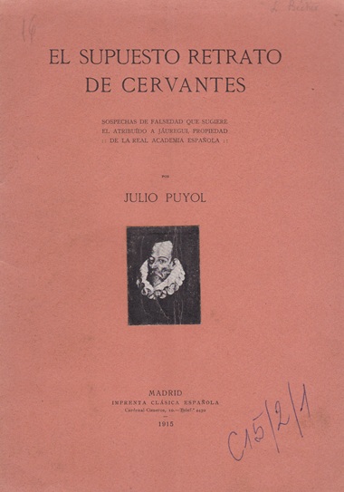 El supuesto retrato de Cervantes : sospechas de falsedad que sugiere el atribuido a Jáuregui, propiedad de la Real Academia Española [texto impreso] / Julio Puyol y Alonso (1865-1937) . - Madrid : Imprenta Clásica Española, 1915 . - 39 p. ; 25 x 17 cm. Documento digitalizado por la Biblioteca Digital Hispánica Idioma : Español (spa)