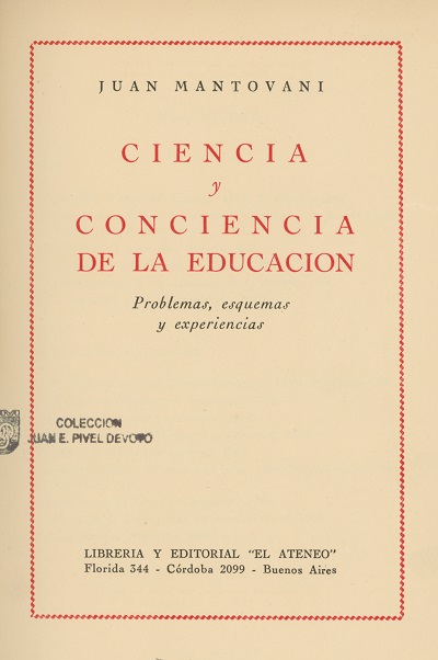 Ciencia y conciencia de la educación : problemas, esquemas y experiencias [texto impreso] / Juan Mantovani . - Buenos Aires : Librería y Editorial "El Ateneo", 1947 . - 396 p. ; 21 x 15 cm. - (Cultura Universal) . Idioma : Español (spa)