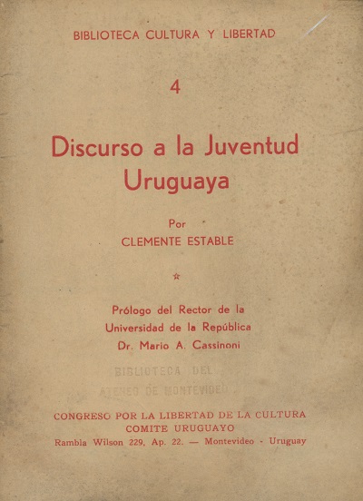 Discurso a la juventud uruguaya [texto impreso] / Clemente Estable ; Mario A. Cassinoni, Prologuista . - Montevideo : Congreso por la Libertad de la Cultura. Comite Uruguayo, 1960 . - 32 p. ; 20 x 15 cm. - (Biblioteca Cultura y Libertad; 4) . Idioma : Español (spa)