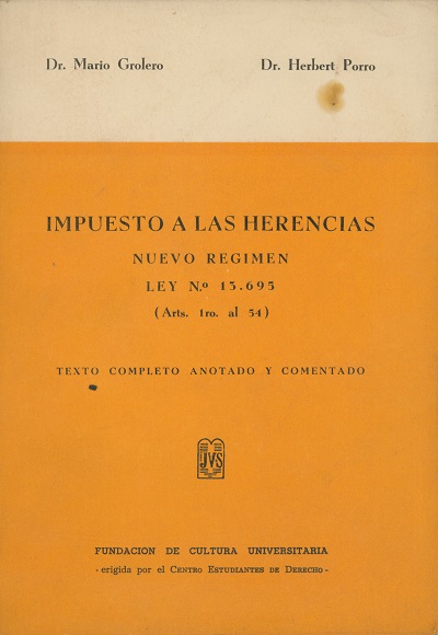 Impuesto a las herencias : nuevo régimen. Ley N.° 13.695 (arts. 1ro. al 54) [texto impreso] / Mario Grolero ; Herbert Porro ; Ramón Valdés Costa, Prologuista . - Montevideo : Fundación de Cultura Universitaria, 1969 . - 75 p. ; 25 x 18 cm. Texto completo, anotado y comentado. Idioma : Español (spa)