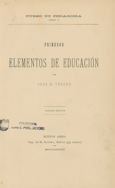 Primeros elementos de educación [texto impreso] / José M. Torres . - 2a. ed. . - Buenos Aires : Imp. de M. Biedma, 1888 . - xlii, 234 p. ; 21 x 14 cm. - (Curso de Pedagogía; 1) . Idioma : Español (spa)