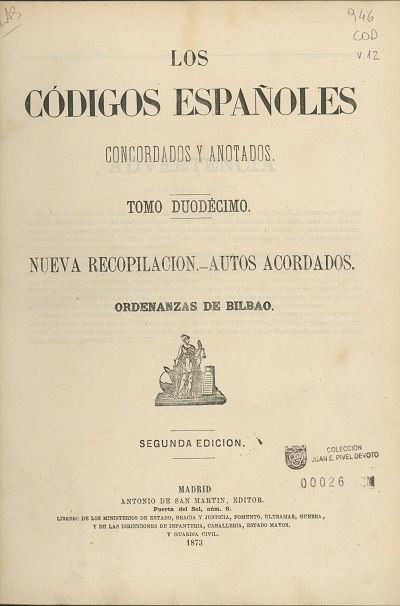 Nueva recopilación : Autos acordados. Ordenanzas de Bilbao [texto impreso] . - 2a.ed . - Madrid : Antonio de San Martin, 1873 . - v.12, 451 p. - (Los códigos españoles concordados y anotados; 12) . Idioma : Español (spa)