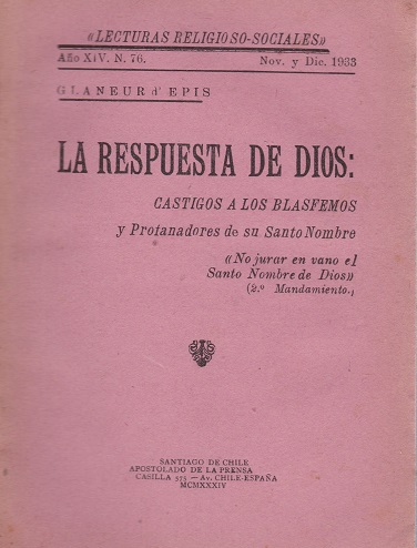 [número]  es un número de Lecturas Religioso-Sociales / Bernardo Gentilini (1911-1936) Año XIV, N°76, 1933 - nov.-dic. - La respuesta de Dios: castigos a los blasfemos y protanadores de su santo nombre [texto impreso] / Glaneur D'Epis . - 1933. Idioma : Español (spa)
