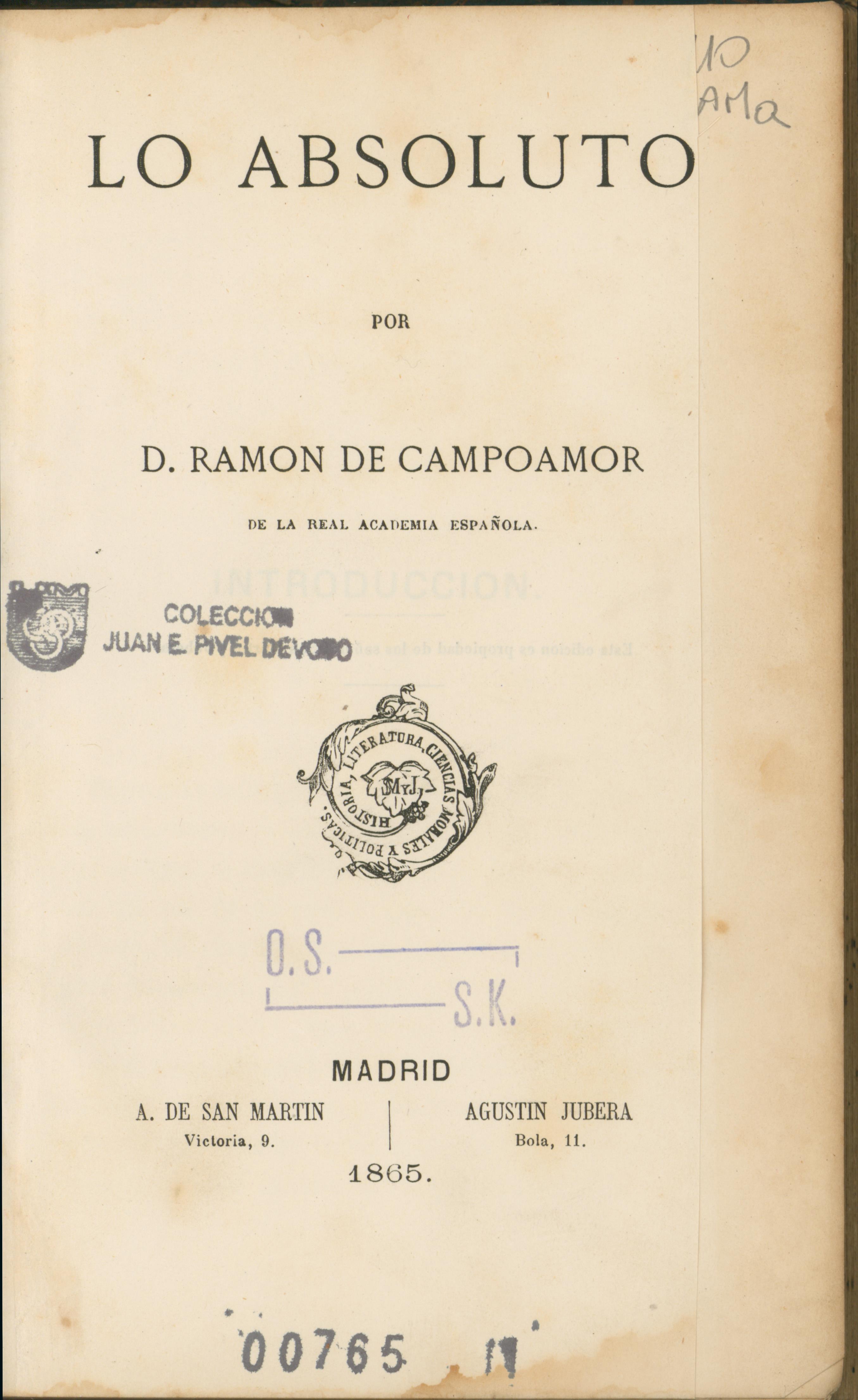 Lo absoluto [texto impreso] / Ramón de Campoamor (1817-1901) . - Madrid : Antonio de San Martin, 1865 . - 360 p. Idioma : Español (spa)