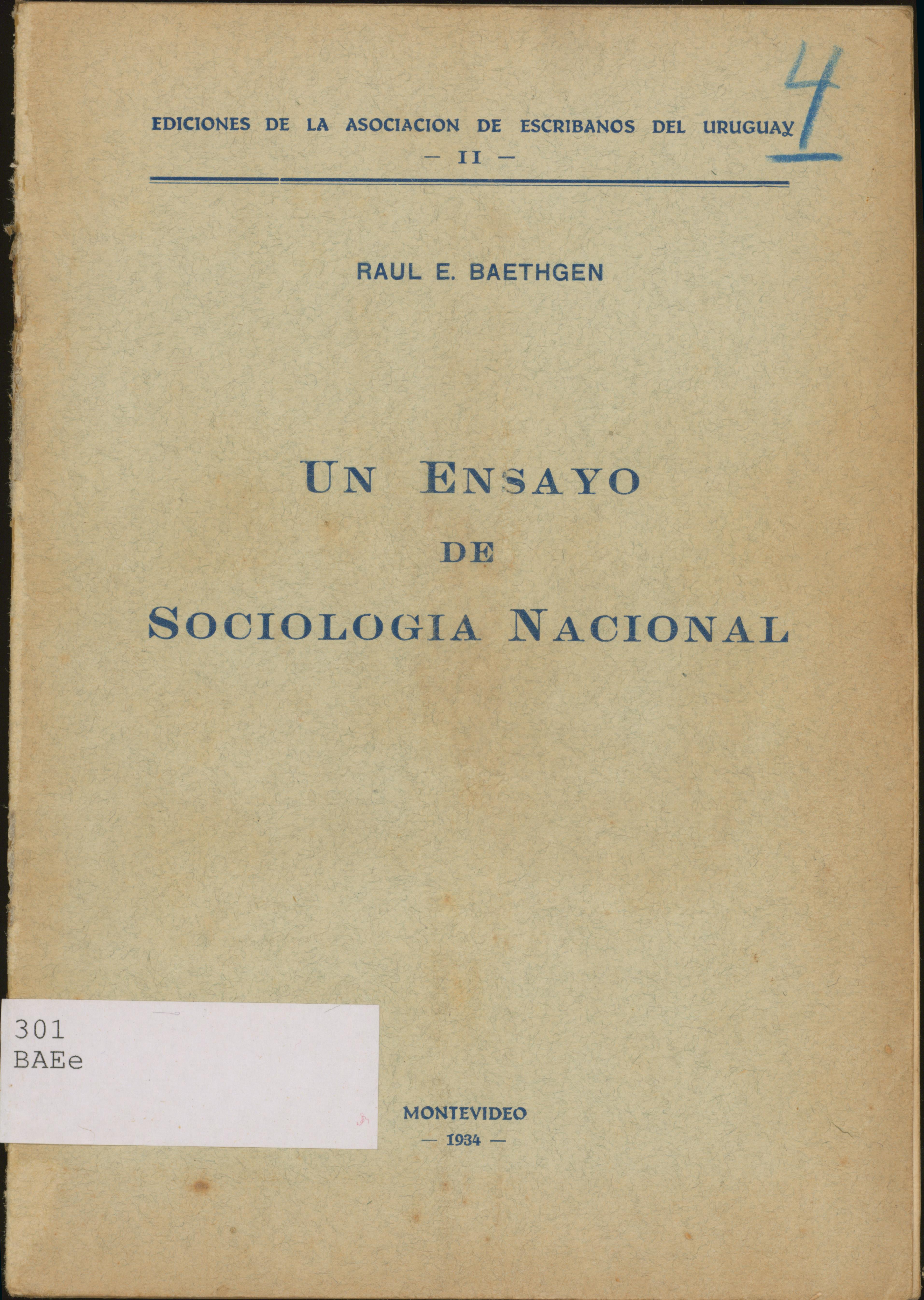 Un ensayo de sociología nacional [texto impreso] / Raúl E. Baethgen . - Montevideo : Ediciones de la Asociación de Escribanos del Uruguay, 1934 . - 27 p. Conferencia pronunciada por el Dr. Raúl E. Baethgen en la Asociación de Escribanos del Uruguay, el 17 de marzo de 1934 Idioma : Español (spa)