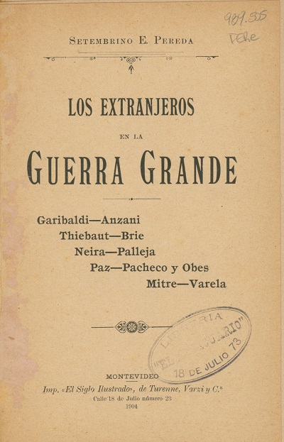 Los extranjeros en la Guerra Grande [texto impreso] / Setembrino E. Pereda . - Montevideo : El Siglo Ilustrado, 1904 . - 325 p. Idioma : Español (spa)